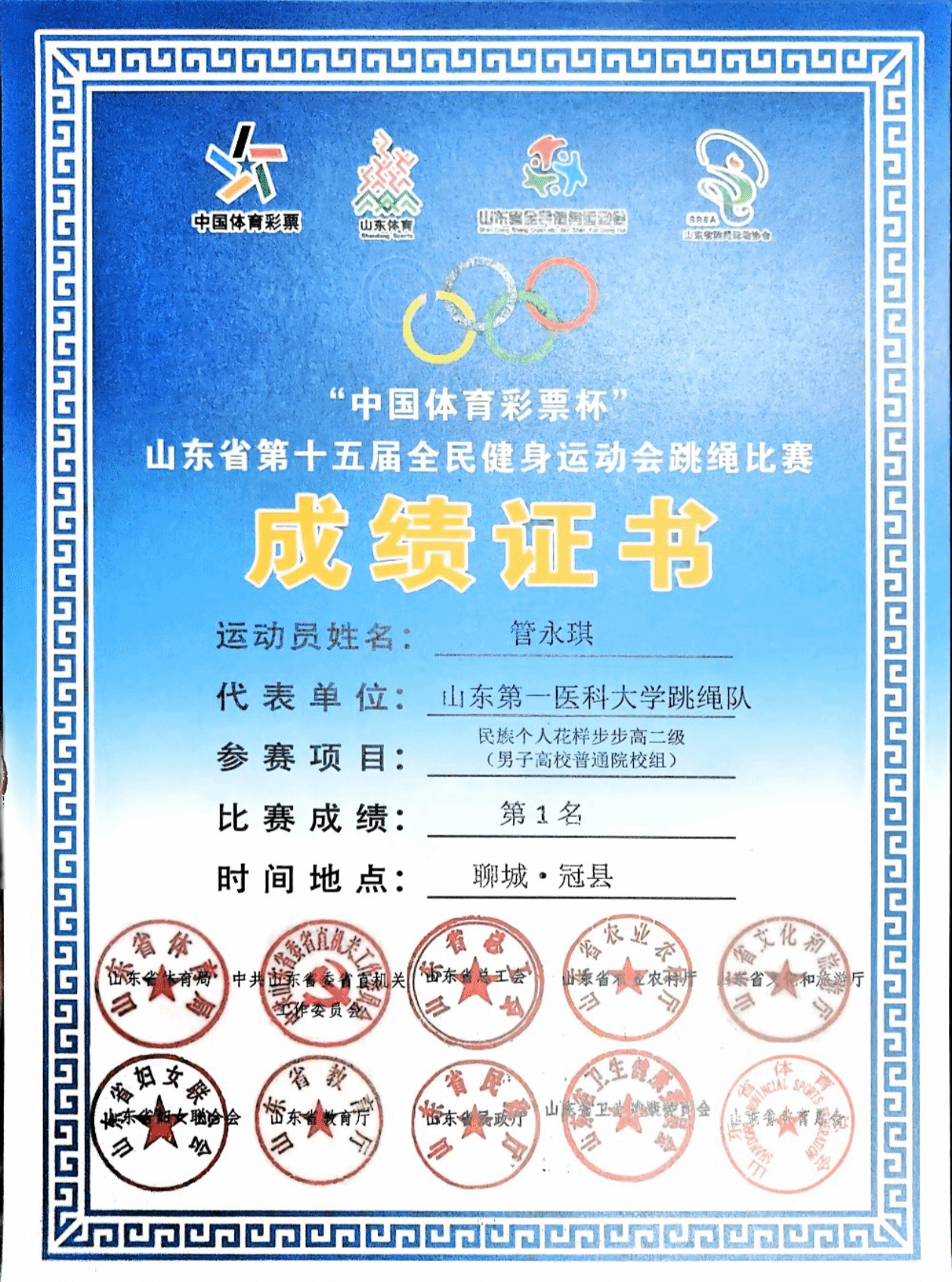 赵倩妘同学获得两人中国轮花样(高校普通院校组)第1名等两项一等奖,三项二等奖及一项三等奖;管永琪同学获得民族个人花样步步高二级(男子高校普通院校组)第1名等一项一等奖,三项二等奖及两项三等奖。一份份荣誉的背后,是他们日复一日地刻苦训练,更是对跳绳运动的热爱与坚守。