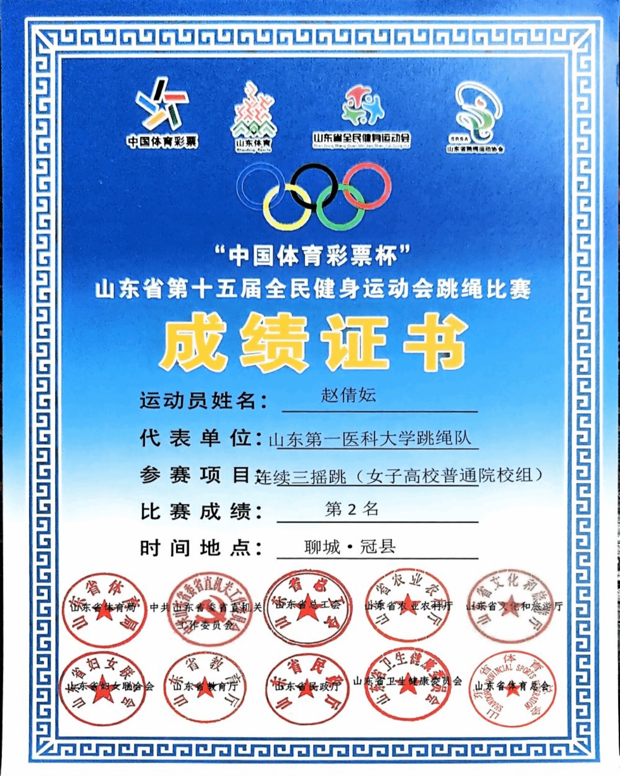 近日,山东省第十五届全民健身运动会跳绳赛圆满落幕,校(院)跳绳俱乐部斩获佳绩。其中护理学院赵倩妘、管永琪同学表现突出,一人揽多枚奖牌,为校(院)争光,尽显护理学子体育风采。