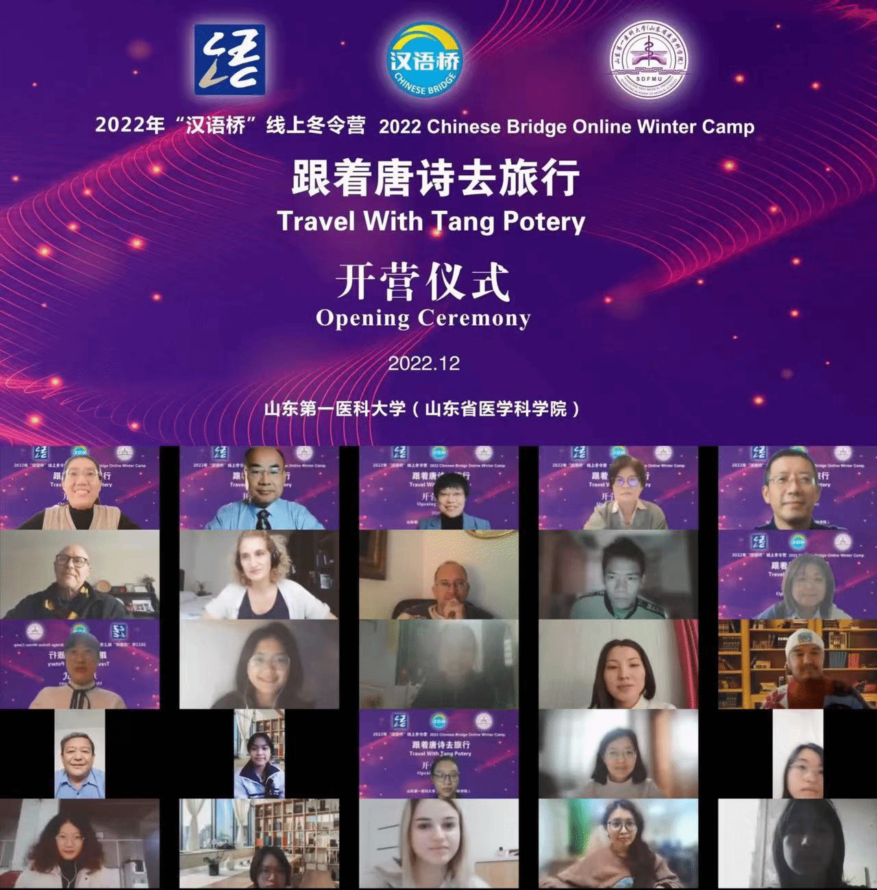 12月1日,由教育部中外语言交流合作中心主办,百度开云体育app(山东省医学科学院)承办的2022年“汉语桥”线上团组交流项目——“跟着唐诗去旅行”中文+旅游线上冬令营举行开营仪式。副校(院)长刘传勇出席开营仪式并致辞。