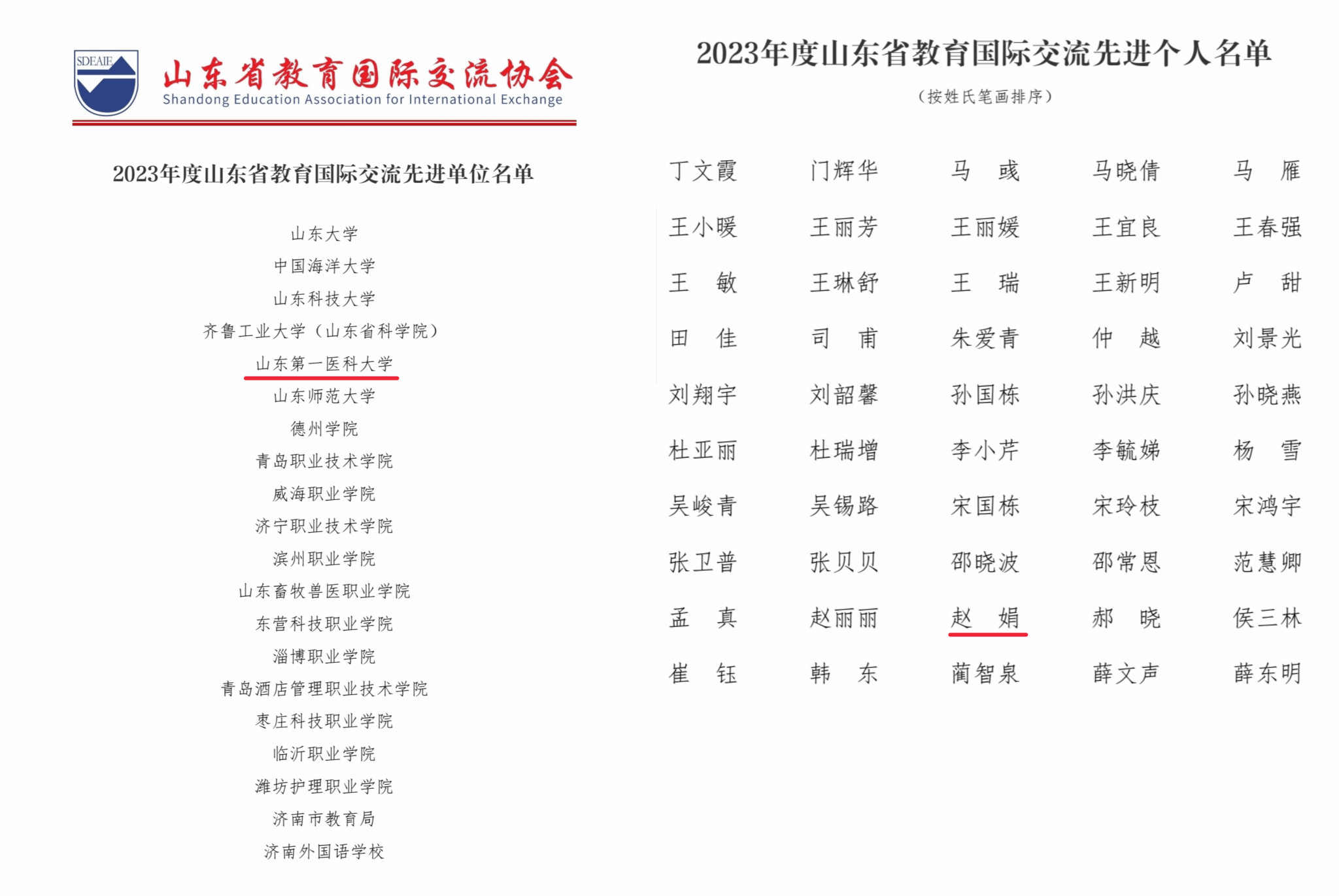 近日,山东省教育国际交流协会公布关于表彰2023年度山东省教育国际交流先进单位及先进个人、山东省教育系统优秀外国专家和优秀来鲁留学生的名单,校(院)获评“2023年度山东省教育国际交流先进单位”,对外合作交流部赵娟同志被评为“2023年度山东省教育国际交流先进个人”,附属肿瘤医院汝昆教授被评为“2023年度山东省教育系统优秀外国专家”,国际教育学院留学生阿里被评为“2023年度优秀来鲁留学生”。