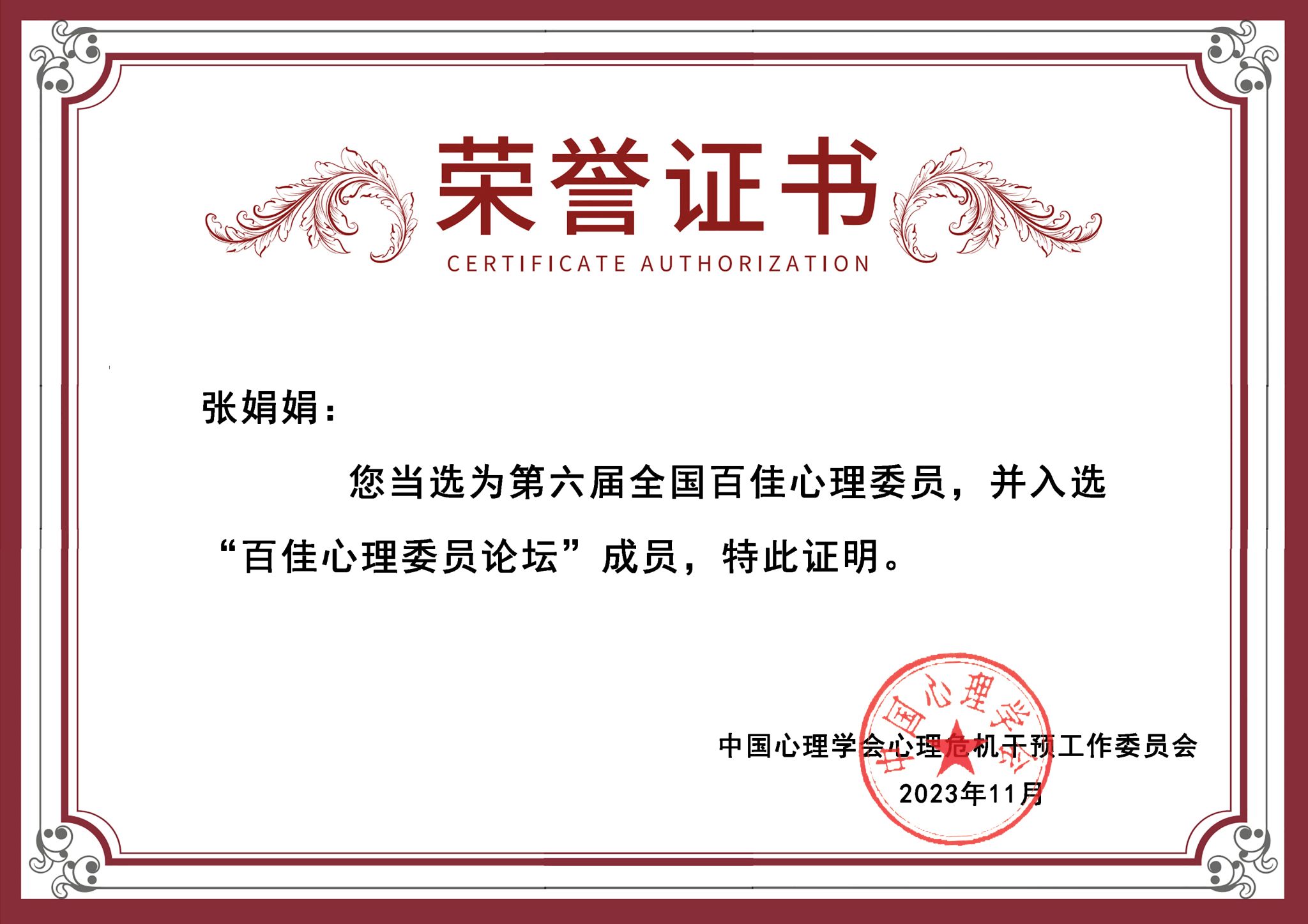 近日,中国心理学会心理危机干预工作委员会颁发了第六届“全国百佳心理委员”和“全国百佳心理委员提名奖”获奖者证书。校(院)外国语学院2021级英语专业张娟娟同学荣获“全国百佳心理委员”称号,王珂熠同学荣获“全国百佳心理委员”提名奖。