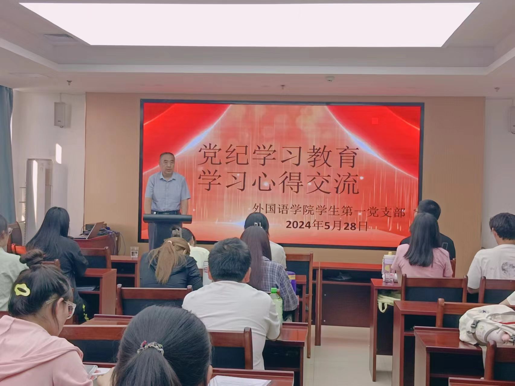 为进一步推进党纪学习教育扎实开展,加强学生党员的党性修养和纪律观念,5月28日下午,外国语学院学生第一党支部在学院党员之家召开了党纪学习教育学习心得交流会。交流会由支部书记李宏伟主持,支部全体党员参加。