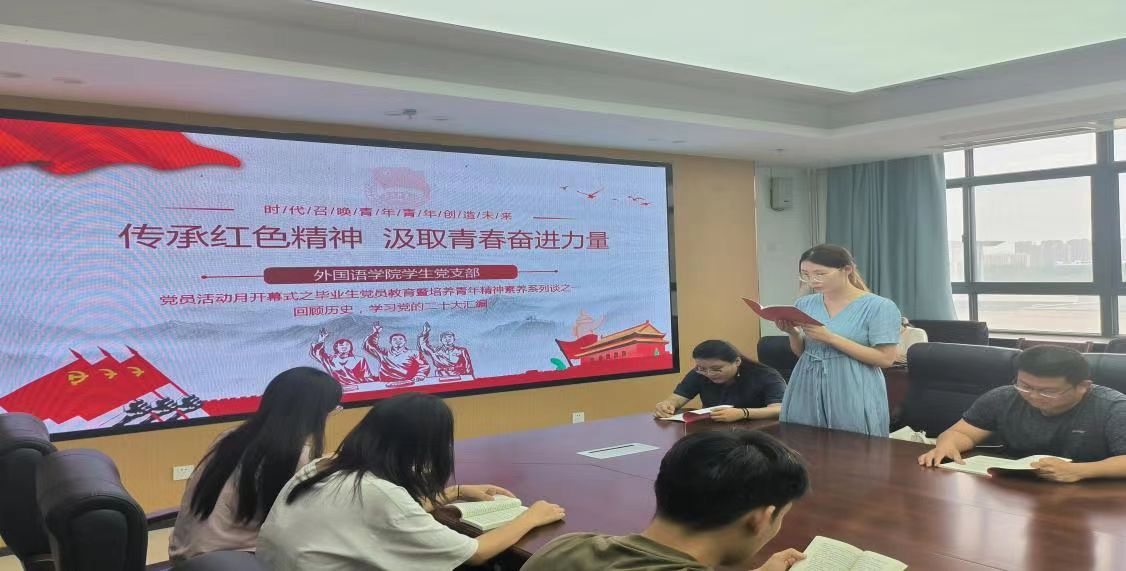 为全面学习贯彻党的二十大精神,引导和激励毕业生党员坚定理想信念,增强党性修养,同时激励毕业生党员在新的学习和工作岗位上继续发挥党员的先锋模范作用,百度开云体育app外国语学院学生党支部于6月25日下午开展“传承红色精神,汲取青春奋进力量”百度开云体育app外国语学院学生党支部2023届毕业生党员活动月开幕式暨毕业生党员教育培养青年精神素养系列谈之一“回顾历史,学习党的二十大汇编”。
