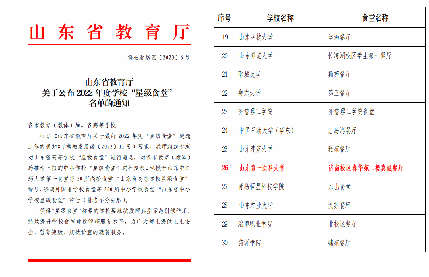 近日,山东省教育厅下发《关于公布2022年度学校“星级食堂”名单的通知》,校(院)济南主校区春华苑二楼真诚餐厅获评“山东省学校星级食堂”,全省共有30所高校食堂获此荣誉称号。