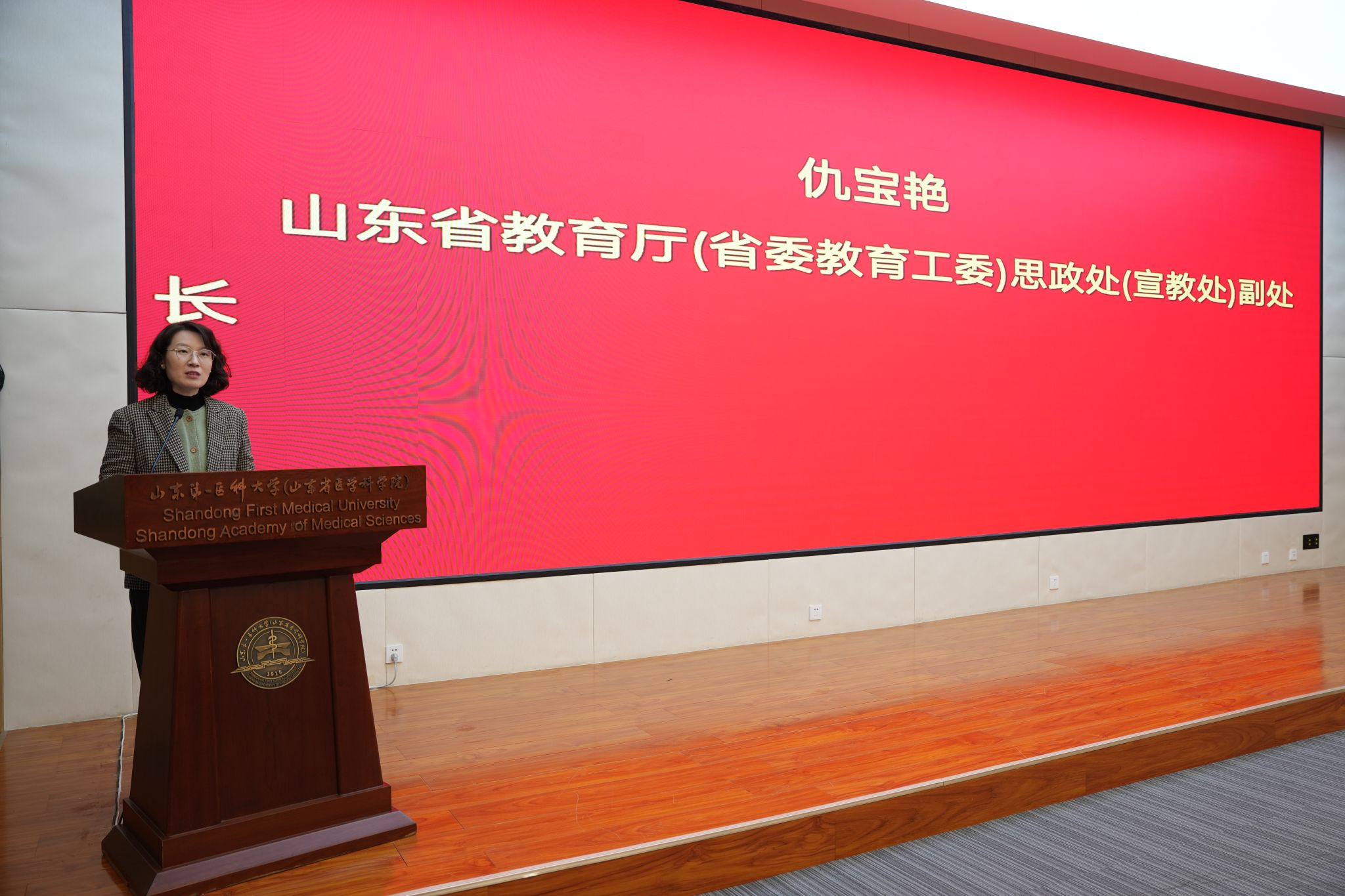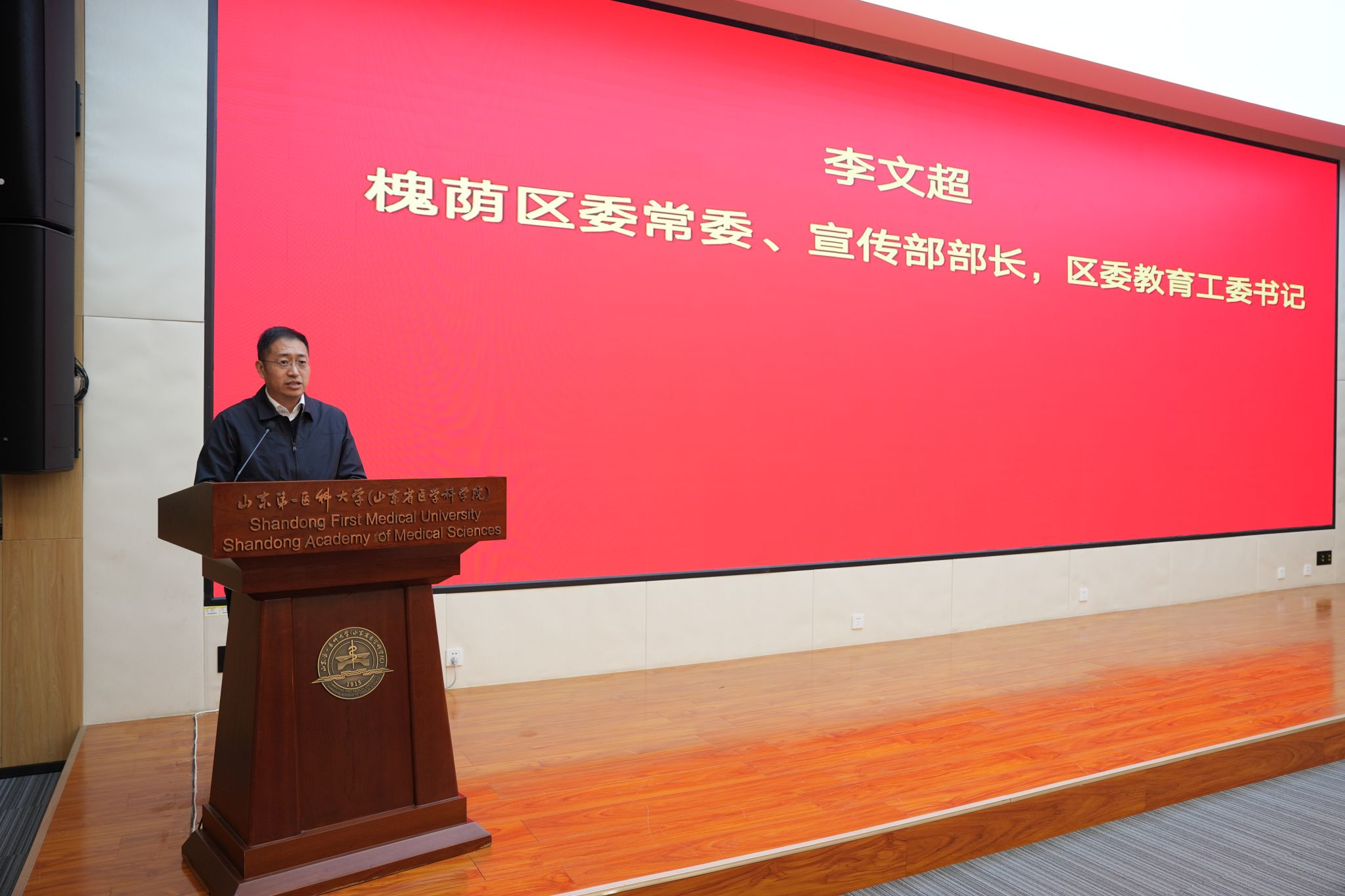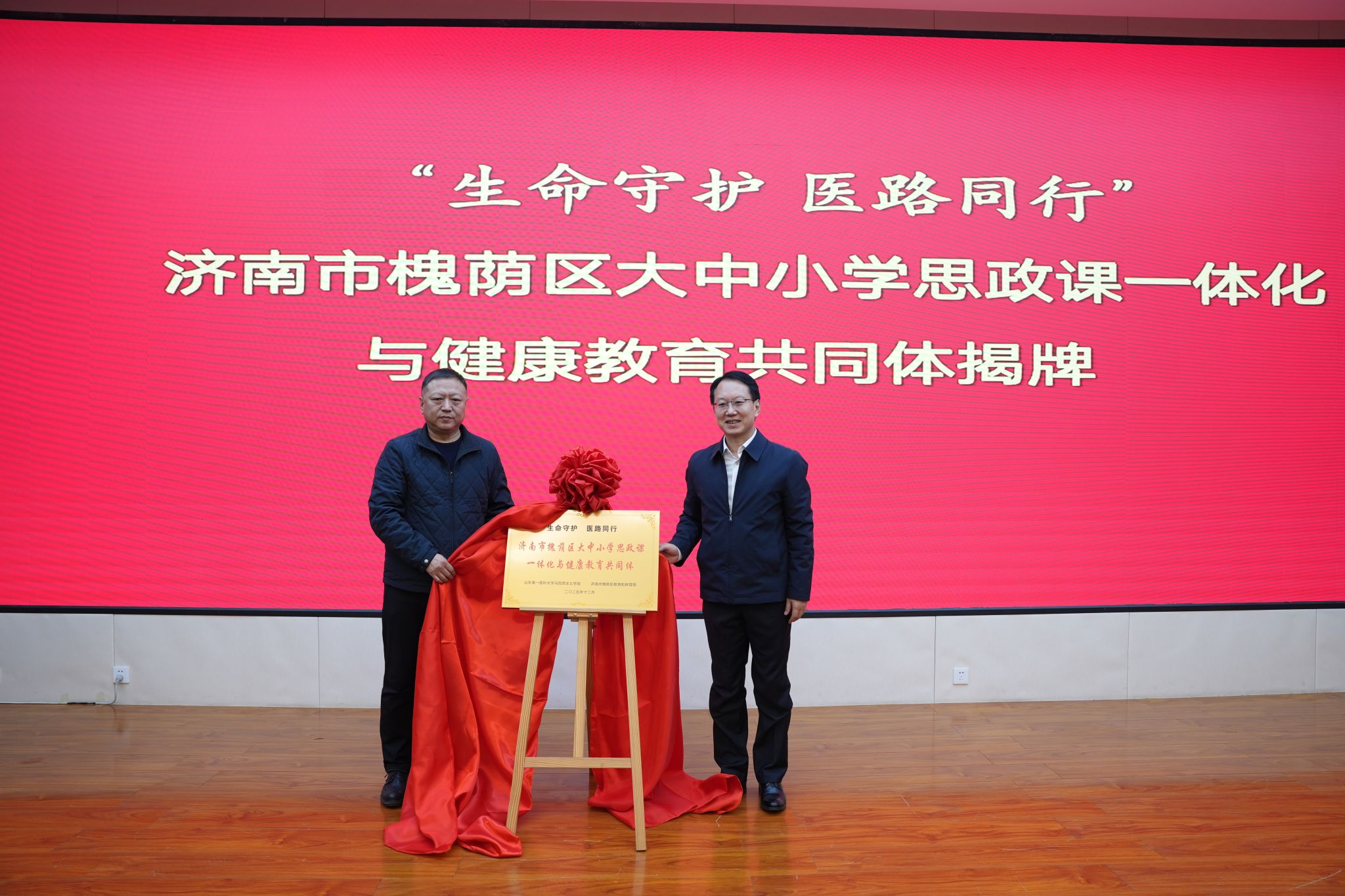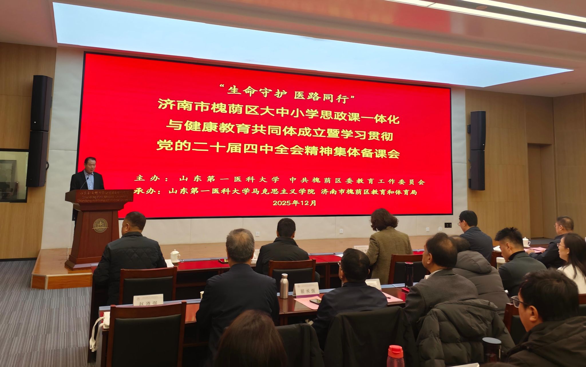 2025年12月16日上午,由学院和济南市槐荫区教育和体育局承办的,学习贯彻党的二十届四中全会精神集体备课会暨“生命守护 医路同行”槐荫区大中小学思政课一体化与健康教育共同体成立仪式,在百度开云体育app济南校区勤笃楼300会议室隆重举行。学校党委委员、副校(院)长贾海宁,槐荫区委常委、宣传部部长、教育工委书记李文超,山东省教育厅思政处副处长仇宝艳等出席成立仪式。