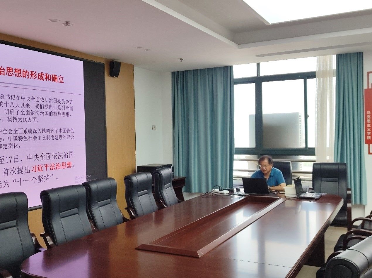为深入开展学习贯彻习近平新时代中国特色社会主义思想主题教育,推动习近平法治思想进课堂进头脑,进一步强化思政课教学改革,提高教学质量和科研层次。7月3日,马克思主义学院开展专题教研活动,此次教研活动由思想道德与法治教研室主办,采用线上线下相结合的方式,邀请山东财经大学法学院副院长纪建文教授参加。许彦彬院长,翟承强书记参加活动,各教研室老师通过腾讯会议参与此次活动。