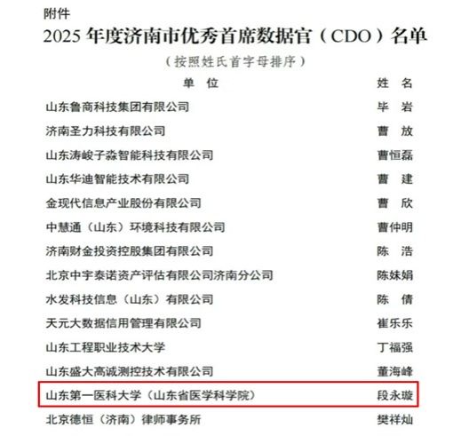 近日,根据《济南市优秀首席数据官(CDO)评价标准》的相关要求,济南市大数据协会、济南市工商联企业家协会、济南市数字经济协会、济南市区块链产业协会、济南市零售连锁行业协会、济南市软件行业协会完成了2025年度济南市优秀首席数据官评审工作。中心段永璇副主任荣获2025年济南市优秀首席数据官称号。此前,他于2023年获得山东省优秀首席数据官称号,2024年获得济南市优秀首席数据官称号,至此实现了连续三年斩获省、市级优秀首席数据官荣誉的佳绩。