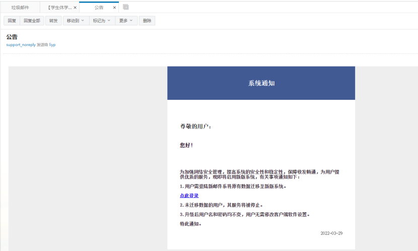 近日,有校(院)职工反馈,通过校(院)邮件系统收到了以“公告”为题的钓鱼邮件,邮件打开后,提示需要将数据迁移至新版邮件系统,并提供了登录链接,如下图: