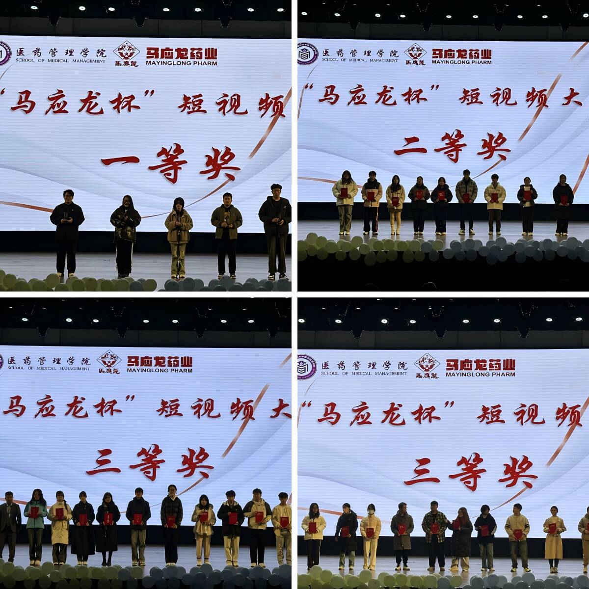 活动伊始,“讲礼帽乐队”便奏响华丽的篇章,为同学们带来《夜空中最亮的星》和《我想当风》,调动了全场的气氛。伴随着动听的音乐,主持人宣布本次“马应龙杯创意短视频大赛”的比赛结果,由杨苗苗、周本富、赵启会、杜江山老师分别为获得三等奖、二等奖、一等奖的队伍上台颁奖。参赛者们用智慧和热情,制作出既有教育意义又充满趣味的短视频作品,传播了健康生活的理念。