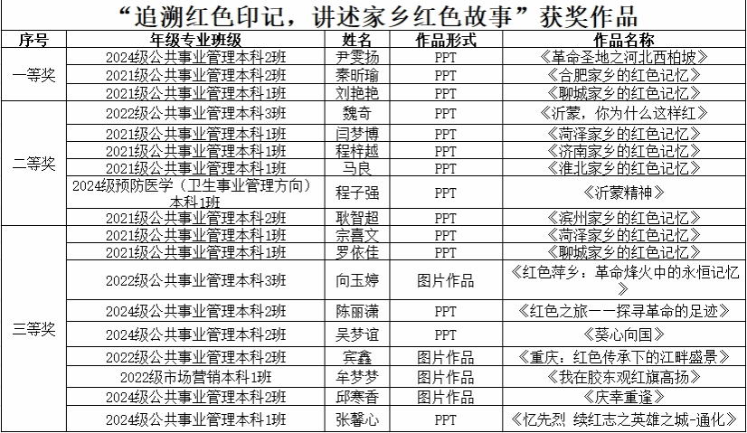 医药管理学院的同学来自全国各地,各自的家乡都有着丰富的红色故事和革命传统。大赛收到学院三个党支部来自不同年级不同专业同学的多幅优秀作品,展现了安徽合肥市、淮北市,广西桂平市,河北革命圣地西柏坡,吉林省通化市,江西省萍乡市,重庆市,山东省济南、临沂、聊城、菏泽、滨州等地方的经典红色故事与英雄人物,参赛作品选取的内容真实、典型、新颖,事迹富有感染力、生动形象,充分反映了家乡的红色文化,具有很强的教育意义,体现了时代精神。经学院评审,2021级公共事业管理本科1班刘艳艳同学的参赛作品《聊城家乡的红色记忆》,2021级公共事业管理本科2班秦昕瑜同学的参赛作品《合肥家乡的红色记忆》,2024级公共事业管理本科2班尹雯扬同学的参赛作品《革命圣地之河北西柏坡》获得一等奖,魏奇等6位同学的参赛作品获得二等奖,宗喜文等9位同学的参赛作品获得三等奖。