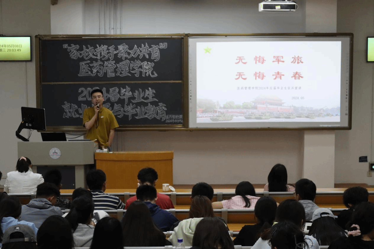为深入宣传国家征兵政策,进一步动员毕业生积极应征入伍,5月8日晚,医药管理学院举办2024年应届毕业生征兵宣讲活动,辅导员张少儒老师主讲。
