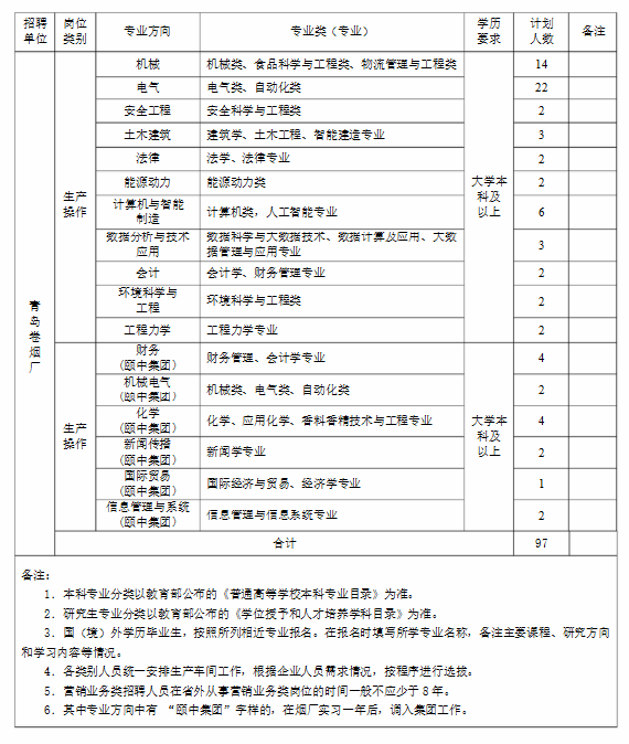 山东中烟工业有限责任公司成立于 2004年2月,是中国烟草总公司的全资子公司,是中央驻鲁国有大型企业。青岛卷烟厂是山东中烟工业有限责任公司下辖的直属非法人卷烟厂,始建于 1919 年,厂区占地 546 亩。根据企业发展需要,现面向社会公开招聘工作人员。具体情况如下: