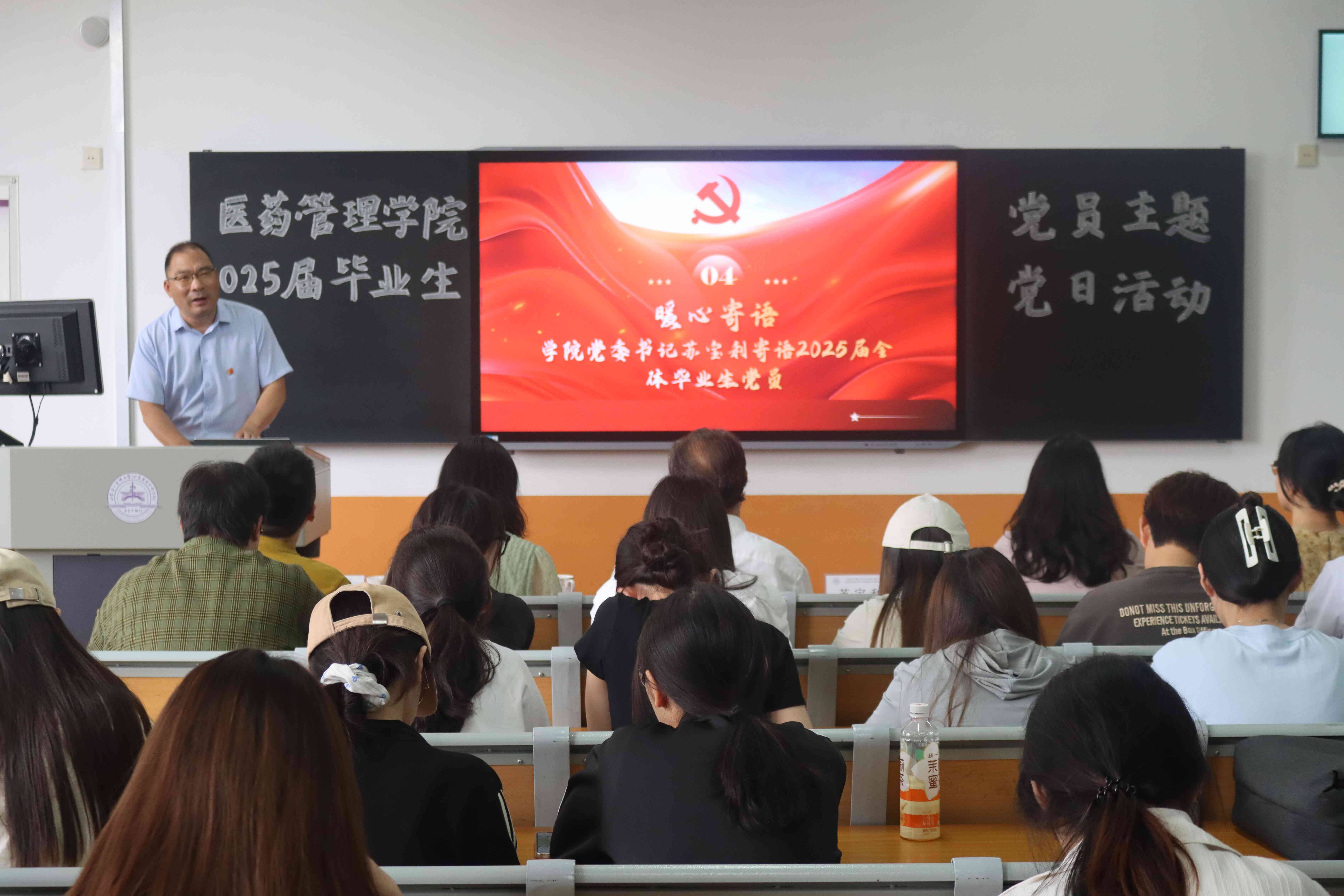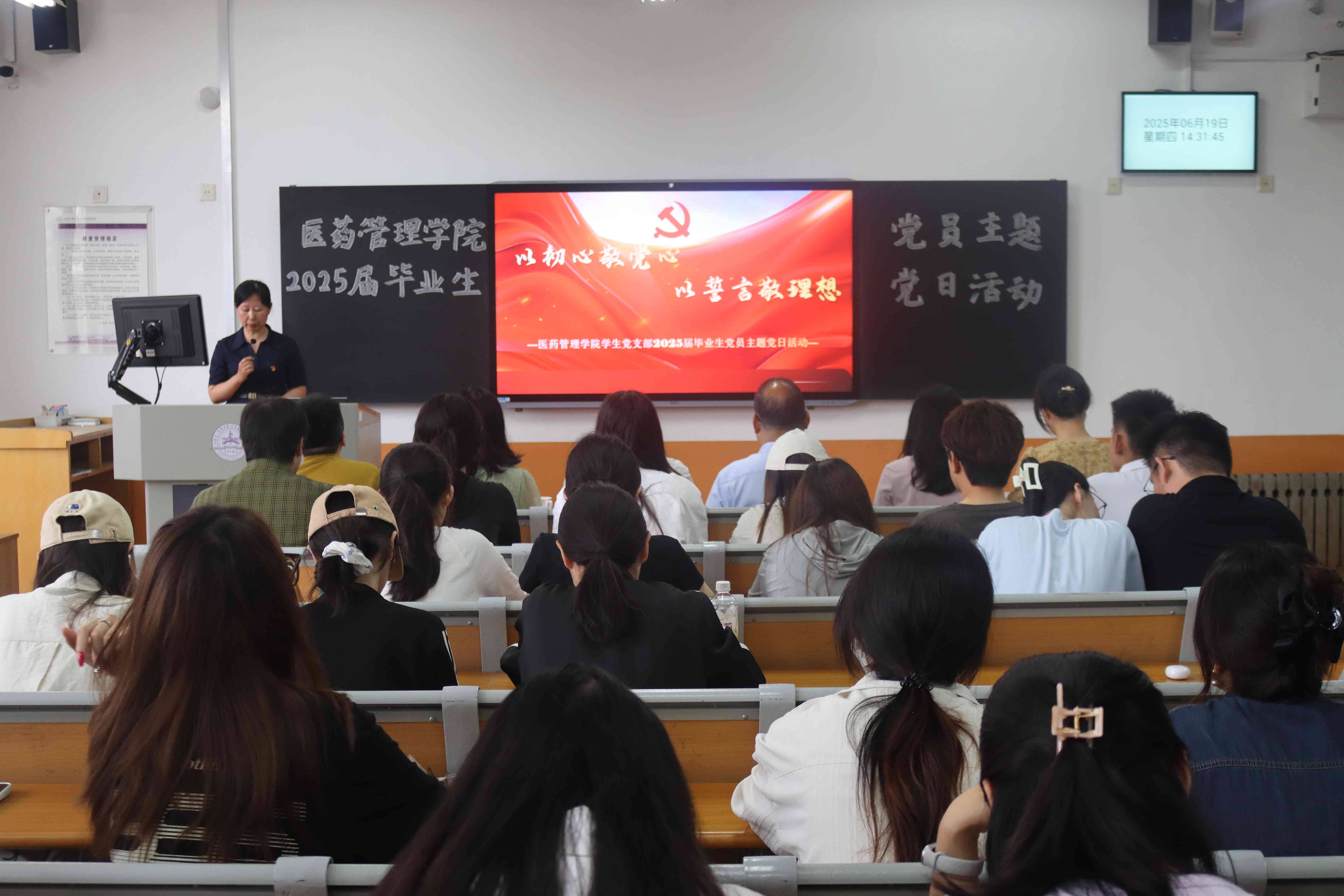 为教育引导毕业生党员牢记入党初心、坚定理想信念、强化党纪意识,充分发挥优秀毕业生党员的榜样示范与先锋模范作用,增强爱校荣校情怀与文明离校意识,激励他们在未来人生征程中持续为党旗增辉、为母校添彩,医药管理学院学生党支部于6月19日在教学南楼C2005成功举办“以初心敬党心,以誓言敬理想”2025届毕业生党员主题党日活动。学院党委书记苏宝利,党委副书记赵启会,组织员周晓芳,团委副书记杨苗苗,毕业班辅导员安静,学生党支部书记张少儒和刘晓丹出席活动,2025届毕业生党员代表及2025年新发展党员代表共同参与,活动由周晓芳主持。