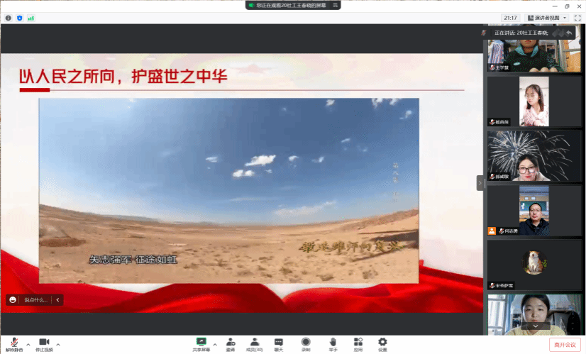 第二环节为同学分享交流。为推动党史学习教育深入青年,培育堪当民族复兴重任的时代新人,确保中国特色社会主义事业继往开来的重要实践路径,全班学生积极响应号召,观看了纪录片《锻造雄狮向复兴》。宋苍萨雪同学以“同心共筑中国梦,继往开来新征程”为主题展开自己的心得分享。