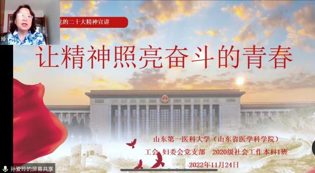 党的二十大是在全党全国各族人民迈上全面建设社会主义现代化国家新征程、向第二个百年奋斗目标进军的关键时刻召开的一次十分重要的大会。为深入学习贯彻党的二十大精神,激励广大青年学生凝心聚力、接续奋斗,2022年11月24日,工会、妇委会党支部深入医药管理学院2020级社会工作本科一班,线上开展领航工程——“学习党的二十大,同心共筑中国梦”交流分享会活动。
