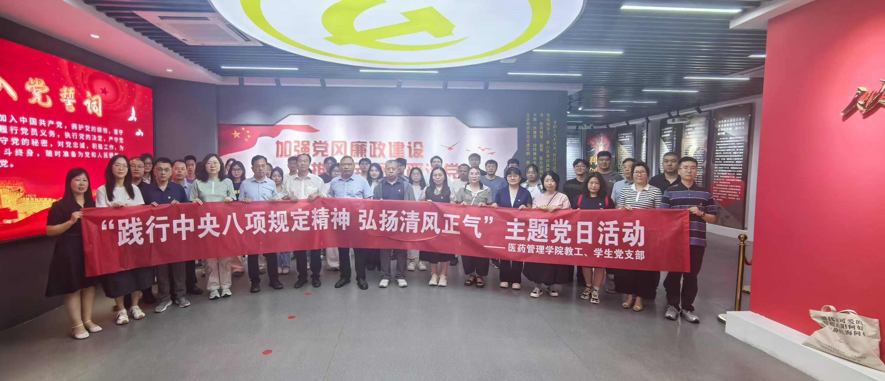 为进一步深入贯彻中央八项规定精神学习教育,强化党员干部对中央八项规定精神的深刻理解,6月17日上午,医药管理学院教工、学生党支部前往泰山区廉政教育馆联合开展“践行中央八项规定精神 弘扬清风正气”主题党日活动,在沉浸式体验中接受廉政教育。学院党委书记苏宝利,党委副书记赵启会,副院长吴立新及教师和学生党员参加。
