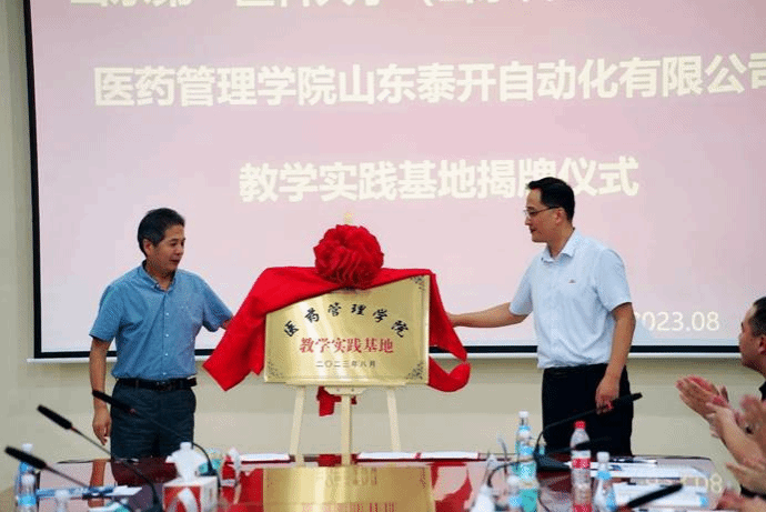 随后,陈海玉、郭兆静代表双方签订教学实践基地协议,陈士福、刘佳参与鉴签。签约仪式完成后,陈士福、刘佳共同为教学实践基地揭牌。仪式最后,医药管理学院领导老师、山东泰开自动化有限公司领导、百度开云体育app医药管理学院校友代表合影留念。
