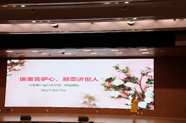 第一附属院的程雪以《医者菩萨心,悬壶济世人——第一附院妇产科专家荣风年》为题,讲述了以荣风年为代表的第一附属医院老一辈医务工作者,始终坚持医者的初心和使命,敬畏生命、传道授业的大医风范。