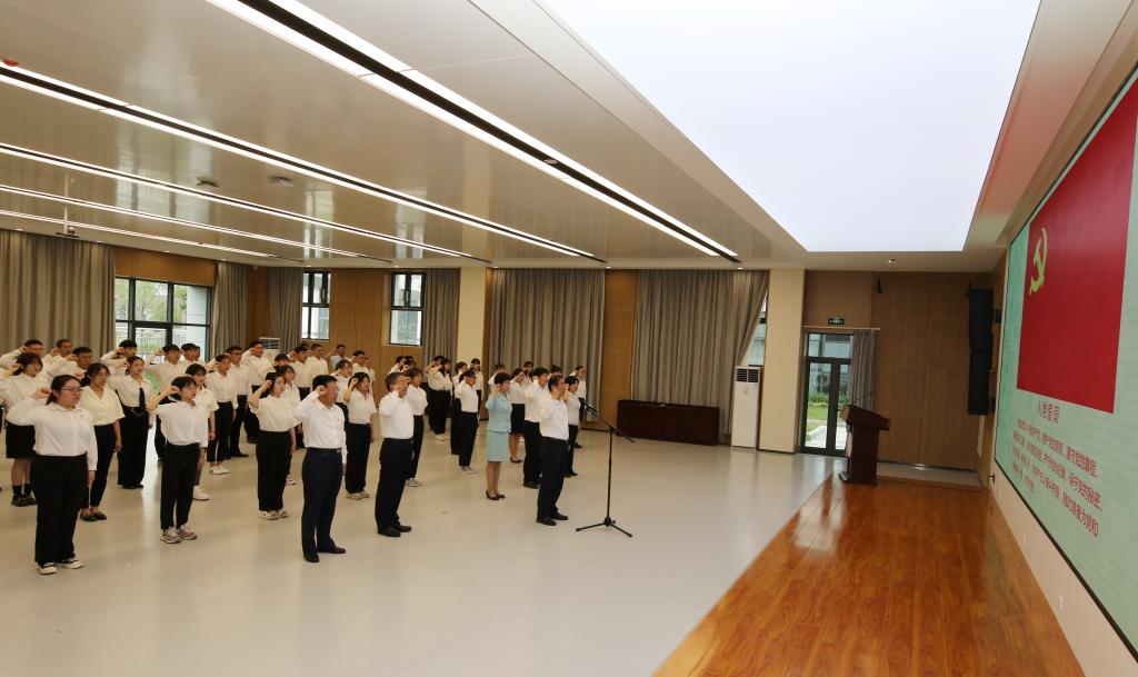 宣誓仪式在雄壮的《国际歌》声中拉开序幕。新党员们列队整齐,全场肃立。面对鲜艳的党旗,韩金祥带领全体党员举起右拳庄严宣誓。在激昂的宣誓声中,每位党员都接受了一次深刻的思想洗礼,更加深切地感受到了新时代党员的精神追求,进一步强化了对党忠诚、全心全意为人民服务的担当使命。新党员代表、基础医学院2019级临床医学国际班王淳同学作表态发言,郑重承诺用实际行动来践行自己的入党誓言,完成肩负的职责和使命。