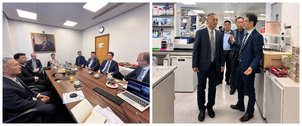 在曼彻斯特大学,代表团与生物医学与健康学部副学部长(分管国际事务)基思·布伦南、协理副学部长孟庆军等深入交流,双方详细讨论了学生交流的长短期项目如暑期学校、学期学年项目、硕博士培养项目以及国家留学基金委创新型人才合作培养项目的实施方案。期间,代表团实地调研了曼彻斯特大学生物科学实验室,了解其在生物医学研究、疾病机制探索等方向的科研布局与技术平台建设等情况。