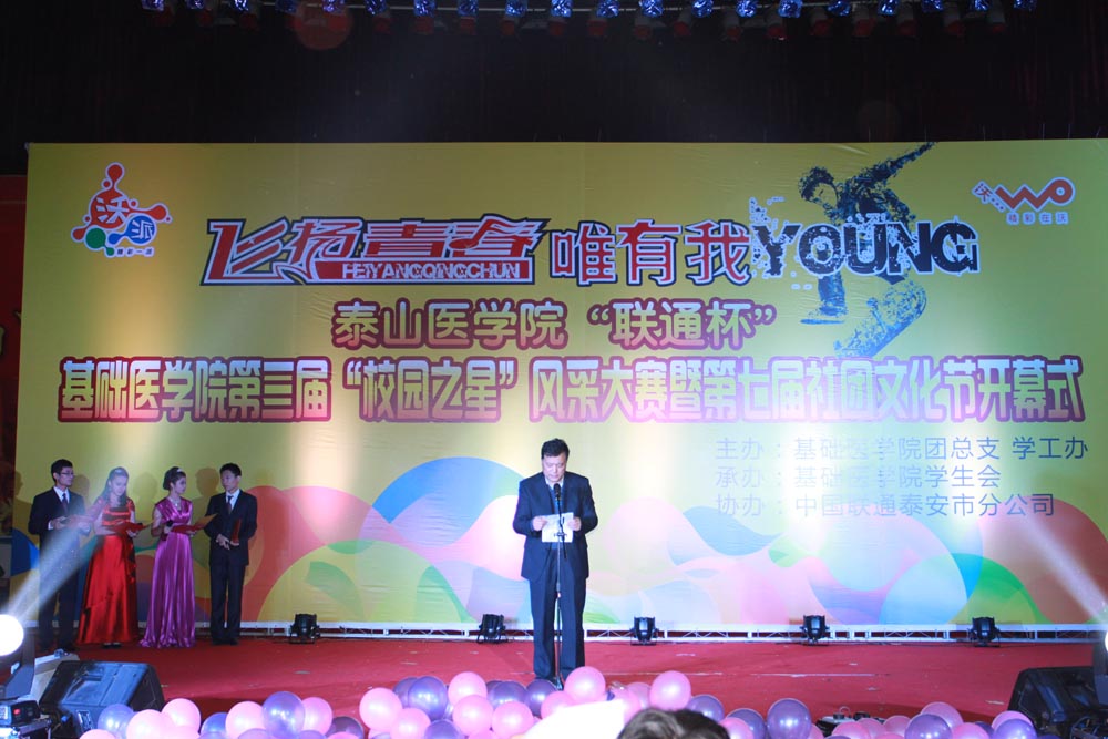 为展现大学生时代风采,丰富同学们的课余生活,11月8日晚7点,基础医学院在天外村校区文体馆成功举办“联通杯”第三届校园之星风采大赛暨第七届社团文化节开幕式,基础医学院院长景学安致开幕辞。