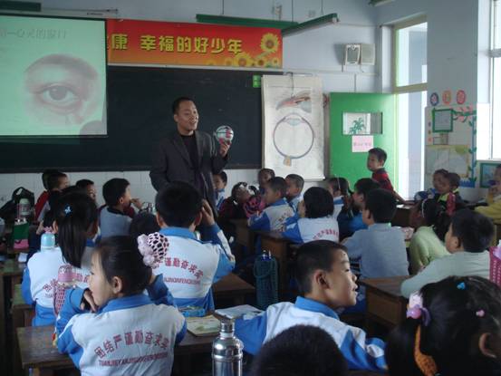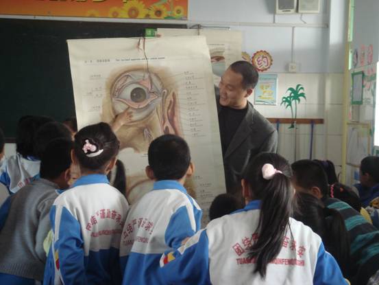 两位老师自带投影仪、电脑、眼球模型及挂图等教具,提前制作好精美的课件,用一节课的时间与北实小三年级四班78名同学共同探讨了眼的基本结构和保健知识,班主任肖老师全程陪同。顿老师首先向小朋友们介绍了支部开展的“深化党员示范岗活动”和参加活动的党员名单,然后切入主题,用深入浅出的讲解方法、通俗易懂的医学词语,结合模型与挂图给同学们详细讲解了眼的基本结构、“黑眼珠”、“白眼珠”等知识;王慧老师重点讲解了近视眼、远视眼形成的原因及预防保健知识。两位老师科普知识组织有序、授课娴熟清晰、语言幽默风趣,博得同学们阵阵掌声。师生之间进行了充分的互动,同学们表现出极高的学习兴趣与极大的好奇心,纷纷举手回答老师提问,并踊跃发言,取得了很好的授课效果。课后,同学们把老师围得水泄不通,问关于眼睛的各种问题,直到放学铃响,才依依不舍地与老师告别。