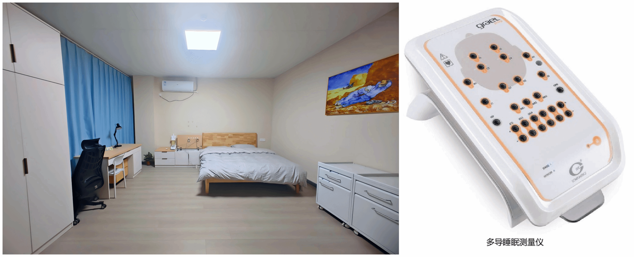 睡眠中心配备3台6导联多导睡眠检测仪,设有3间独立睡眠实验室,可实现对睡眠呼吸、脑电、肌电、眼动等多项生理信号的同步监测与分析,支持睡眠障碍、打鼾、呼吸暂停等相关疾病的精确评估与诊断。