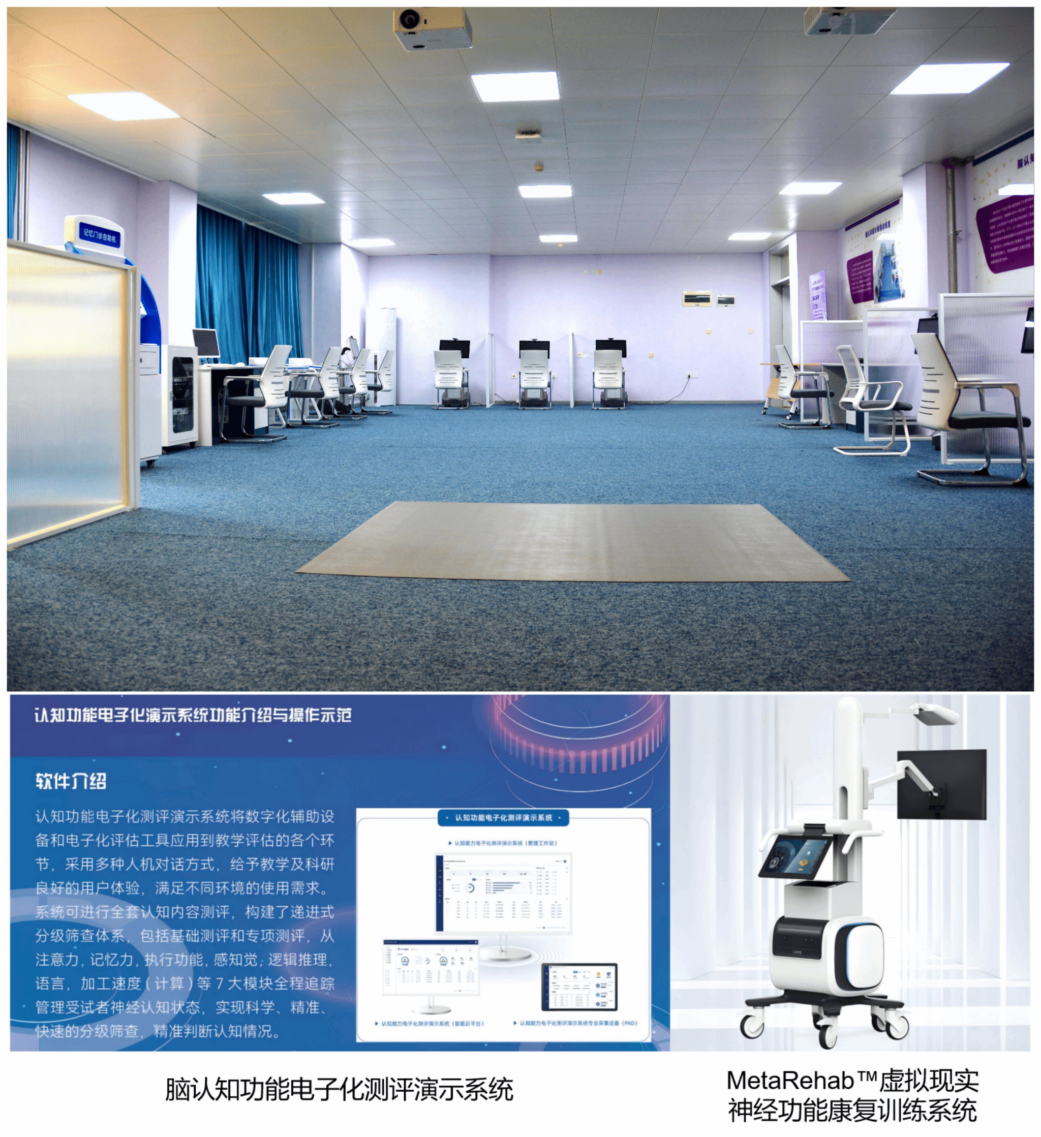 认知评估与训练平台由三大子系统构成:脑认知功能电子化测评演示系统、MetaRehab™虚拟现实神经功能康复训练系统,以及脑认知功能专项增强训练系统。平台集用户管理、标准化测评与个性化训练于一体,全面支撑脑认知康复训练与科研教学的智能化管理与多场景应用。