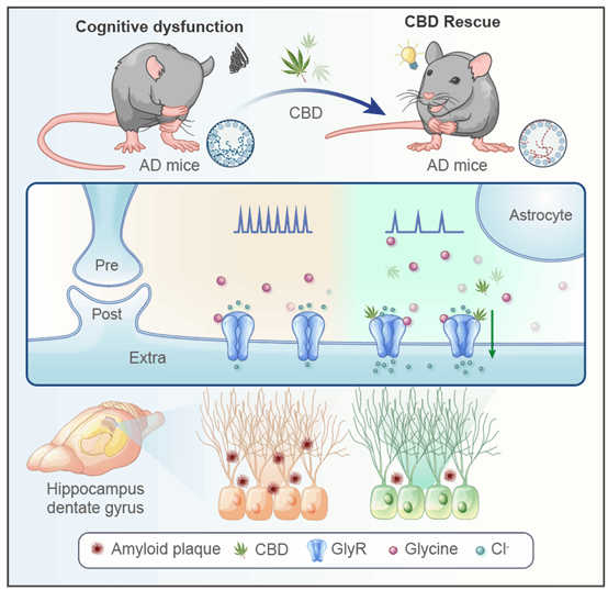 该研究发现,慢性CBD给药可以显著减轻AD小鼠模型中的认知缺陷和海马中的Aβ病理。CBD的主要疗效通过增强海马齿状回DG中的抑制性突触外甘氨酸受体(GlyR)的功能来实现。体外和体内的电生理记录及钙成像实验显示,CBD通过GlyR介导的抗AD作用主要是通过降低AD小鼠DG颗粒细胞的神经元亢奋来实现的。此外,腺相关病毒(AAV)介导的DG GlyRα1的消融或GlyRα1S296A突变,可以特异性地破坏CBD的结合,显著阻断其抗AD作用。该发现不仅揭示了CBD治疗AD的新机制,而且强调了GlyR作为治疗AD的新靶点的重要性,为开发新的治疗策略提供了科学依据。