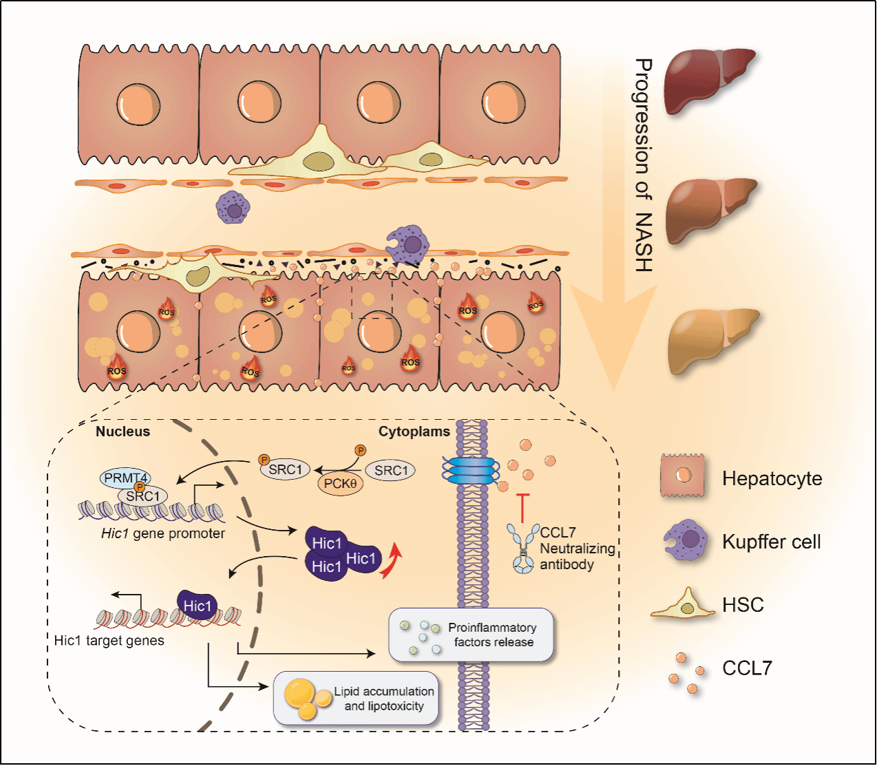 代谢紊乱相关脂肪性肝病(metabolic dysfunction associated steatotic liver disease, MASLD)已经成为世界范围内慢性肝脏疾病最常见的病因。在中国,MASLD患者人数2030年预计将达到3.15亿。目前临床尚没有治疗MASLD的特效药物。李子龙团队在前期研究中发现,细胞因子CCL7在肝损伤中介导巨噬细胞趋化作用(Redox Biol, 2021)。给与小鼠注射CCL7中和抗体进行干预,显著缓解MASLD进程。转录组测序结果提示,转录因子HIC1是肝细胞中CCL7效应的主要介导者。机制研究发现,在营养过剩应激作用下蛋白激酶PKCθ通过磷酸化转录辅因子SRC-1从而促进SRC-1招募组蛋白精氨酸甲基转移酶PRMT4激活HIC1转录。与这一模型相一致的是,在小鼠肝脏特异敲除HIC1/SRC-1或使用PRMT4小分子抑制剂干预均可显著缓解MASLD进程。更重要的是,MASLD患者肝组织中HIC1表达水平和脂肪性肝损伤指标呈正相关关系。