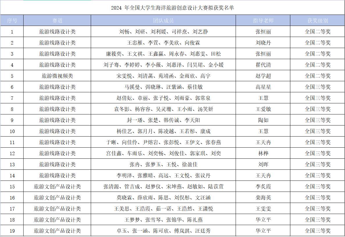 近日,2024年全国大学生海洋旅游创意设计大赛完美收官。护院学子们积极参赛,认真备赛,凭借新颖的题材和独特的创意设计,在激烈角逐中脱颖而出,成功斩获二等奖5项,三等奖14项。