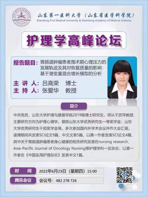 此次论坛通过腾讯会议在线的形式开展,共邀请来自首都医科大学、山东大学、青岛大学及延边大学等多位青年博士进行讲座和经验分享,学院院长柳韦华、副院长张爱华分别主持论坛,学院教师、研究生与各附属医院护理工作者以及来自全国部分兄弟院校的师生共1000余人参加学习。