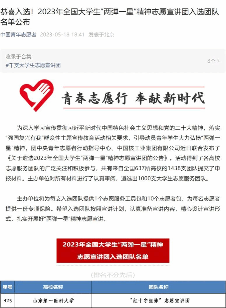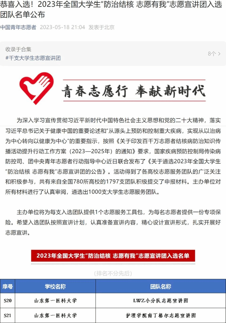 护理学院“红十字姐妹”志愿宣讲团入选2023年全国大学生“两弹一星”精神志愿宣讲团;南丁格尔志愿宣讲团、LWZ小分队志愿宣讲团入选2023年全国大学生“防治结核 志愿有我”志愿宣讲团;“生命树”志愿服务队入选2023年“七彩假期”志愿服务示范团队。