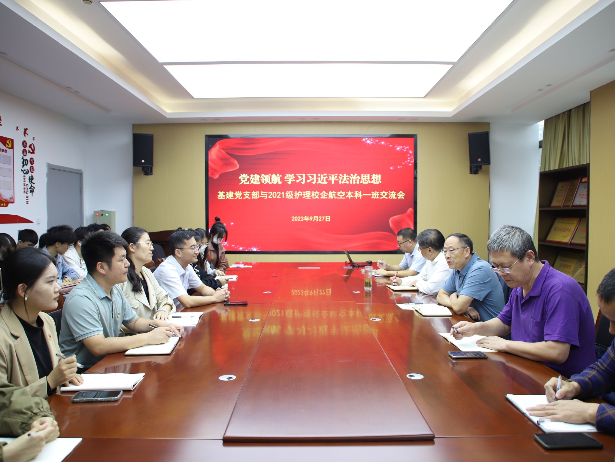 为深入学习领会习近平法治思想,9月27日,校(院)基建部党支部携手2021级护理学校企合作(航空方向)本科一班全体同学共同开展以“习近平法治思想”为主题的领航座谈会。基建部党支部书记任志国和支部党员一行五人出席会议,护理学院党委书记张延玲参加会议。