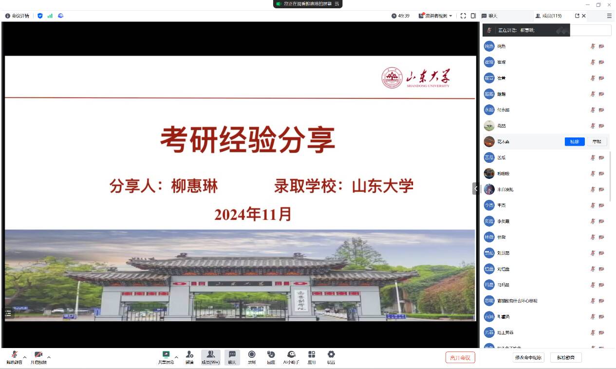 2025年考研进入倒计时,为帮助2021级考研学子优化备考策略,提升复习效率,平衡好实习、就业与考研之间的关系,近日,护理学院举办线上考研经验交流会,本次交流会邀请了2024届4名考研成功的同学做经验分享。