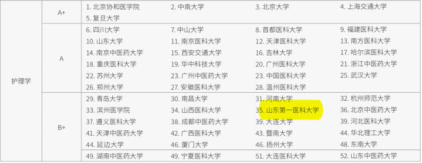 护理学专业全国高校排名第35名(全国共有141所高校),评定等级为B+。助产学专业全国高校排名第10名(全国共有29所高校),山东省高校排名第1位,评定等级为B+。两个专业综合排名均居全国前20%。另外,在2021软科中国最好学科排名中,我院护理学科排在前40%,全国共有38所大学上榜。