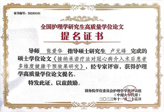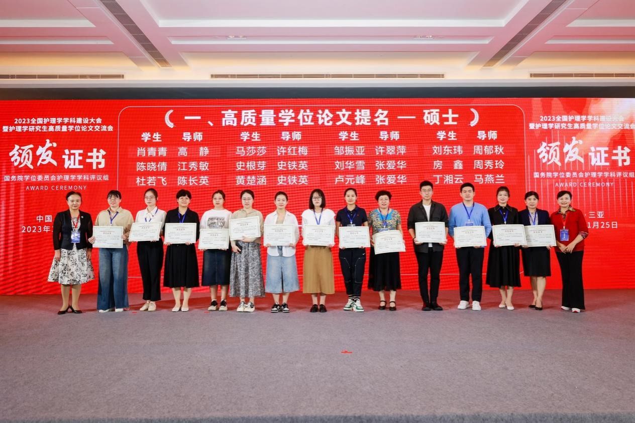 为拓宽学院教师及研究生学术视野,加强学科建设、提升护理研究生的培养质量,在张爱华院长带领下,本次大会护理学院共有6位教师及研究生参加。前期由教育部护理学学科评议组开展的“高质量学位论文评选工作”也在本次学科建设大会上公布了评选结果。本次评选收到了全国近70所院校,2020届至2023届硕博学生的232篇优秀硕博论文,其中博士论文73篇,硕士论文159篇,共评选出24篇高质量博士学位论文,48篇高质量硕士学位论文。我学院共选送4篇硕士学位论文参与评选,其中张爱华导师指导的卢元峰、刘华雪2位护理学硕士研究生的学位论文获评高质量学位论文提名奖。