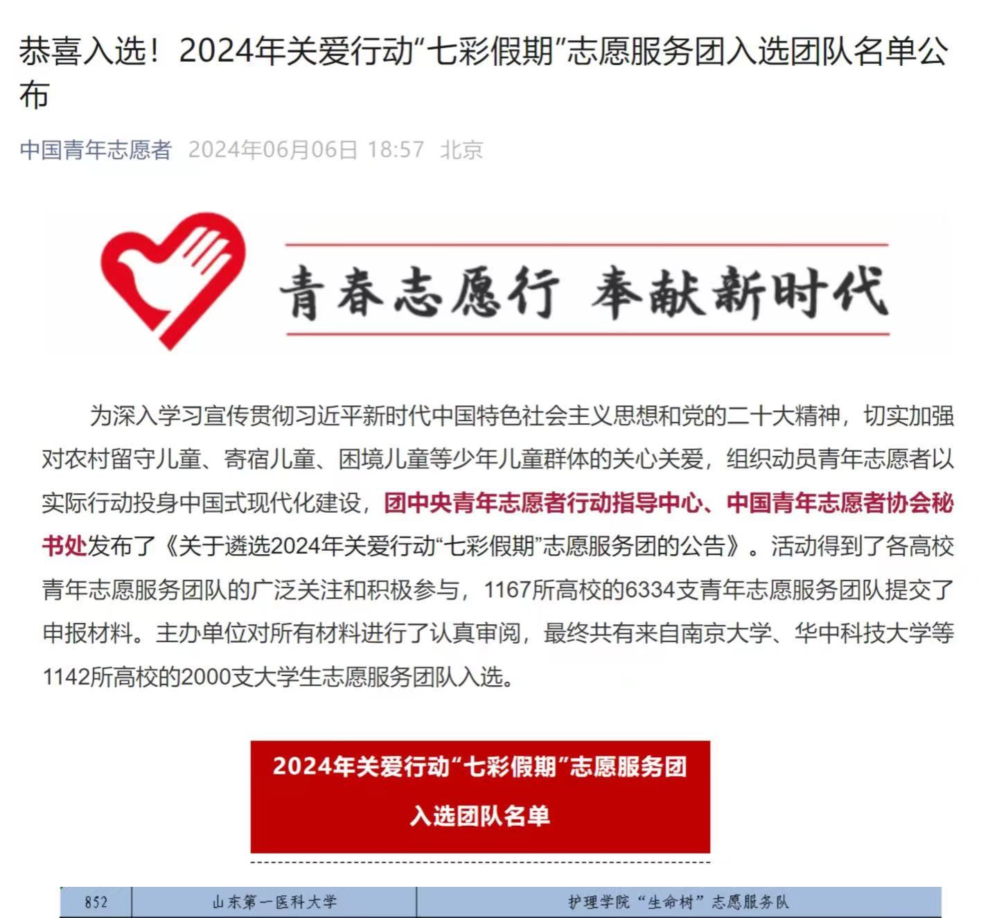 为深入学习宣传贯彻习近平新时代中国特色社会主义思想和党的二十大精神,组织动员青年志愿者以实际行动投身中国式现代化建设,团中央青年志愿者行动指导中心、中国青年志愿者协会秘书处面向全国高校青年志愿者团队发起2024年关爱行动“七彩假期”志愿服务团遴选活动。2024年6月6日,山一大护理学院“生命树”志愿服务队成功入选全国“七彩假期”志愿服务团。
