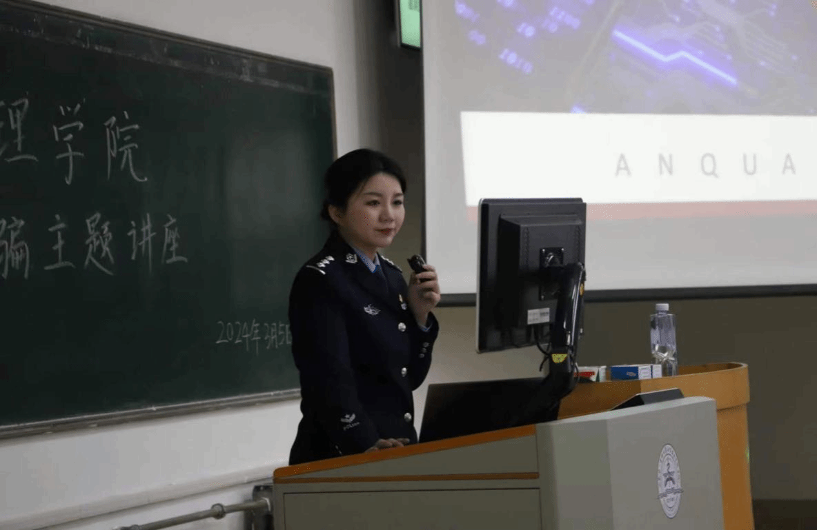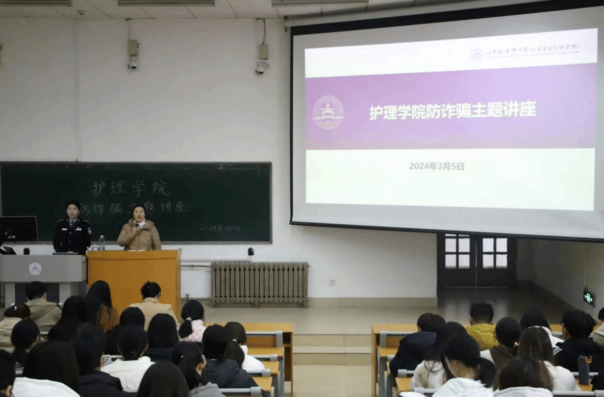 为进一步增强学生防范电信诈骗意识,提高学生在网络时代的自我保护能力,为争创全国文明校园,筑牢安全防线,3月5日下午,护理学院在教学南楼C1014举办防诈骗主题讲座。此次讲座邀请泰安市高新区凤凰派出所副所长李慧、校(院)安保部治安科科长刘爱庆、赵振鲁以及学院辅导员参加,凤凰派出所崔庆娜警官主讲。