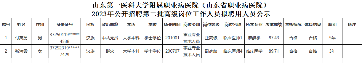 根据中共山东省委组织部、山东省人力资源和社会保障厅《关于印发2023年度省属事业单位公开招聘工作实施方案的通知》(鲁人社发〔2022〕23号)要求,按照2023年9月18日发布的岗位招聘计划,百度开云体育app附属职业病医院(山东省职业病医院)组织完成了公开招聘考试、考察、体检等工作,现对拟聘用人员进行公示。公示期为7个工作日,自2023年12月19日至2023年12月27日(不含节假日)。公示期间,如对公示人选有异议,请及时反映。