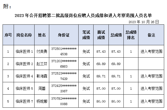 根据中共山东省委组织部、山东省人力资源和社会保障厅《关于印发2023年度省属事业单位公开招聘工作实施方案的通知》(鲁人社发〔202223号)、《山东省事业单位公开招聘工作规程》及我院公开招聘工作方案有关规定,经公开报名、资格审查、面试等程序,现公布附属职业病医院2023年公开招聘第二批高级岗位应聘人员的成绩和进入考察范围人员名单(见附件)。其中,按照“面试采取简化程序的岗位,可设定面试合格分数线,达到分数线的进入考察范围”的规定,经备案同意,设定面试分数线70分。