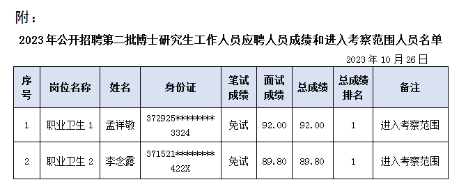 根据中共山东省委组织部、山东省人力资源和社会保障厅《关于印发2023年度省属事业单位公开招聘工作实施方案的通知》(鲁人社发〔2022〕23号)、《山东省事业单位公开招聘工作规程》及我院公开招聘工作方案有关规定,经公开报名、资格审查、面试等程序,现公布2023年公开招聘第二批博士研究生工作人员应聘人员的成绩和进入考察范围人员名单(见附件)。其中,按照“面试采取简化程序的岗位,可设定面试合格分数线,达到分数线的进入考察范围”的规定,经备案同意,设定面试分数线70分。