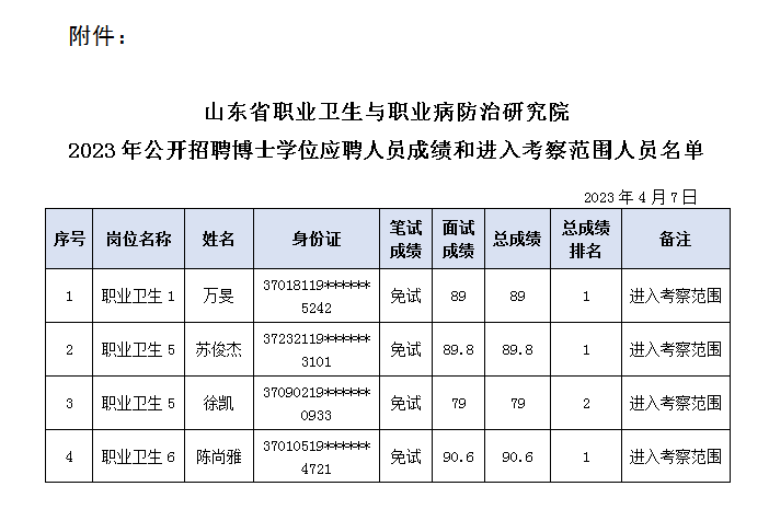 根据中共山东省委组织部、山东省人力资源和社会保障厅《关于印发2023年度省属事业单位公开招聘工作实施方案的通知》(鲁人社发〔2022〕23号)、《山东省事业单位公开招聘工作规程》及我院公开招聘工作方案有关规定,经公开报名、资格审查、面试等程序,现对2023年公开招聘博士学位应聘人员的成绩和进入考察范围人员名单(见附件)进行公示。其中,按照“面试采取简化程序的岗位,可设定面试合格分数线,达到分数线的进入考察范围”的规定,经备案同意,设定面试分数线70分。