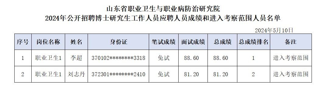 根据中共山东省委组织部、山东省人力资源和社会保障厅《关于印发2024年度省属事业单位公开招聘工作实施方案的通知》(鲁人社发〔2023〕14号)、《山东省事业单位公开招聘工作规程》及我院公开招聘工作方案有关规定,经公开报名、资格审查、面试等程序,现公布2024年公开招聘博士研究生工作人员应聘人员的成绩和进入考察范围人员名单(见附件)。其中,按照“面试采取简化程序的岗位,可设定面试合格分数线,达到分数线的进入考察范围”的规定,经备案同意,设定面试分数线70分。
