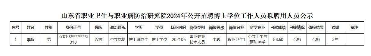 根据事业单位公开招聘有关规定,按照2024年4月10日发布的岗位招聘计划,山东省职业卫生与职业病防治研究院组织完成了公开招聘工作人员的面试、考察、体检等工作,单位已对所有人员的证明材料进行了严格审核并确保其真实性,现对拟聘用人员进行公示。公示期为7个工作日,自2024年7月5日至2024年7月15日。公示期间,如对公示人选有异议,请及时反映。