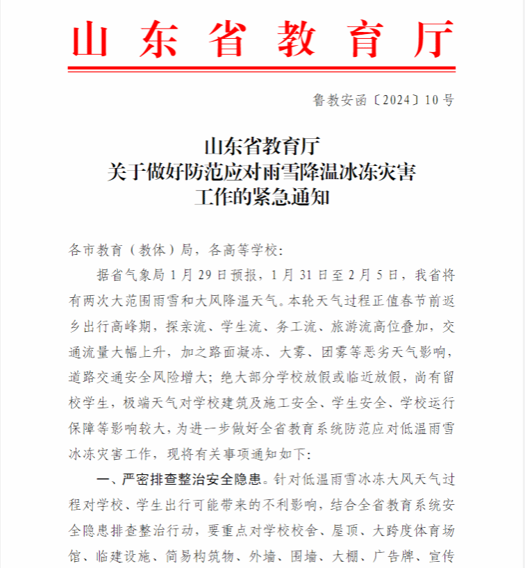 转发山东省教育厅《关于做好防范应对雨雪降温冰冻灾害工作的紧急通知》
