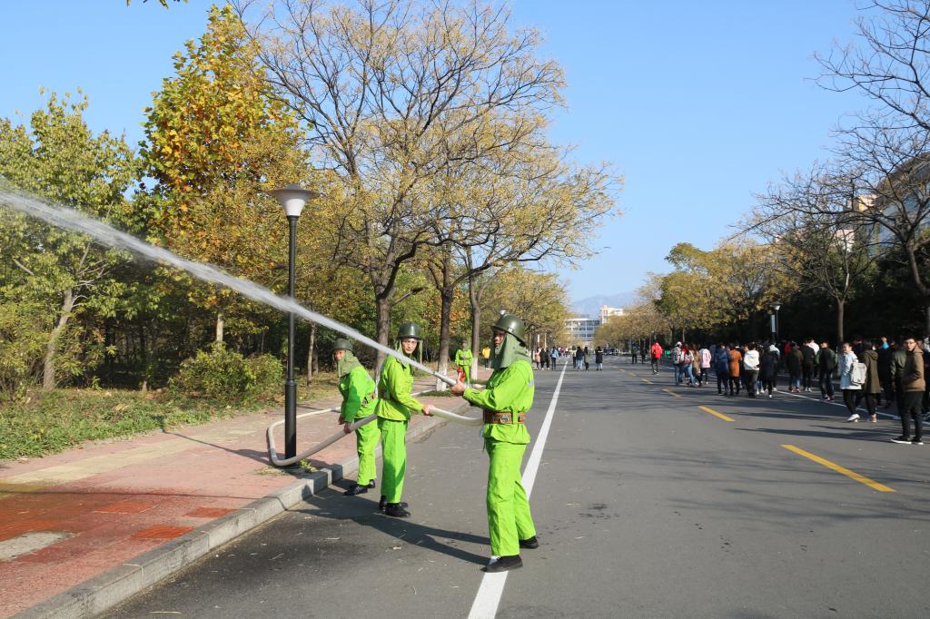 东方大道上,随着指挥旗的摆动,25个火盆依次燃起。同学们按照义务消防队员讲解的灭火器使用方法,根据扑救火灾的动作要领,有序地进行初起火情扑救,实地、实情学习掌握灭火的基本技能。室外消火栓扑救火灾演练中,队员们熟练配合、动作娴熟,引起了围观师生的阵阵掌声,取得了很好的教学效果。