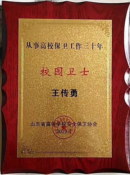 在刚刚结束的山东省高等学校安全保卫协会年会上,对我省长年战斗在安全保卫工作第一线,从事高校保卫工作三十年以上的工作人员予以表彰,授予“校园卫士”荣誉牌。