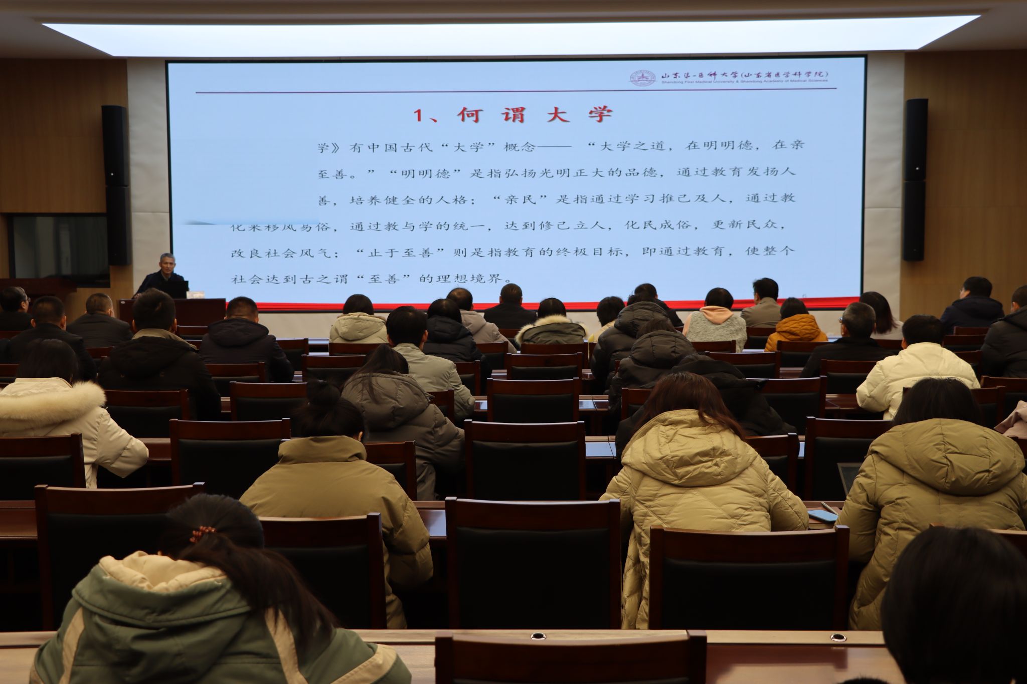 马鲁豫以《赓续校史优秀文化,开启一流大学建设新征程》为题,深刻阐释了“大学和文化的关系”“大学精神是校史文化的凝聚”的深刻内涵,深情讲述了校(院)百年医脉传承中形成的“一部家谱、五大故事”丰富内涵,从“薪火初燃”、“复新继起”、“烽火办学”、“医教新生”到“融合筑峰”,生动展现了校(院)自1915年山东省立医学讲习所创立以来历经的百年辉煌春秋,以及校(院)栉风沐雨、弦歌不辍的办学历程;“抗战烽火西迁办学”、“红色血脉初心如磐”、“灭病除疠四连冠”、“楼德办学艰苦育才”、“蝶变成势融合之光”五大故事,歌颂了老一辈“医学教育家”和“医防人”守初心、担使命的政治自觉,以人民为中心,全心全意为人民服务的高贵品质。