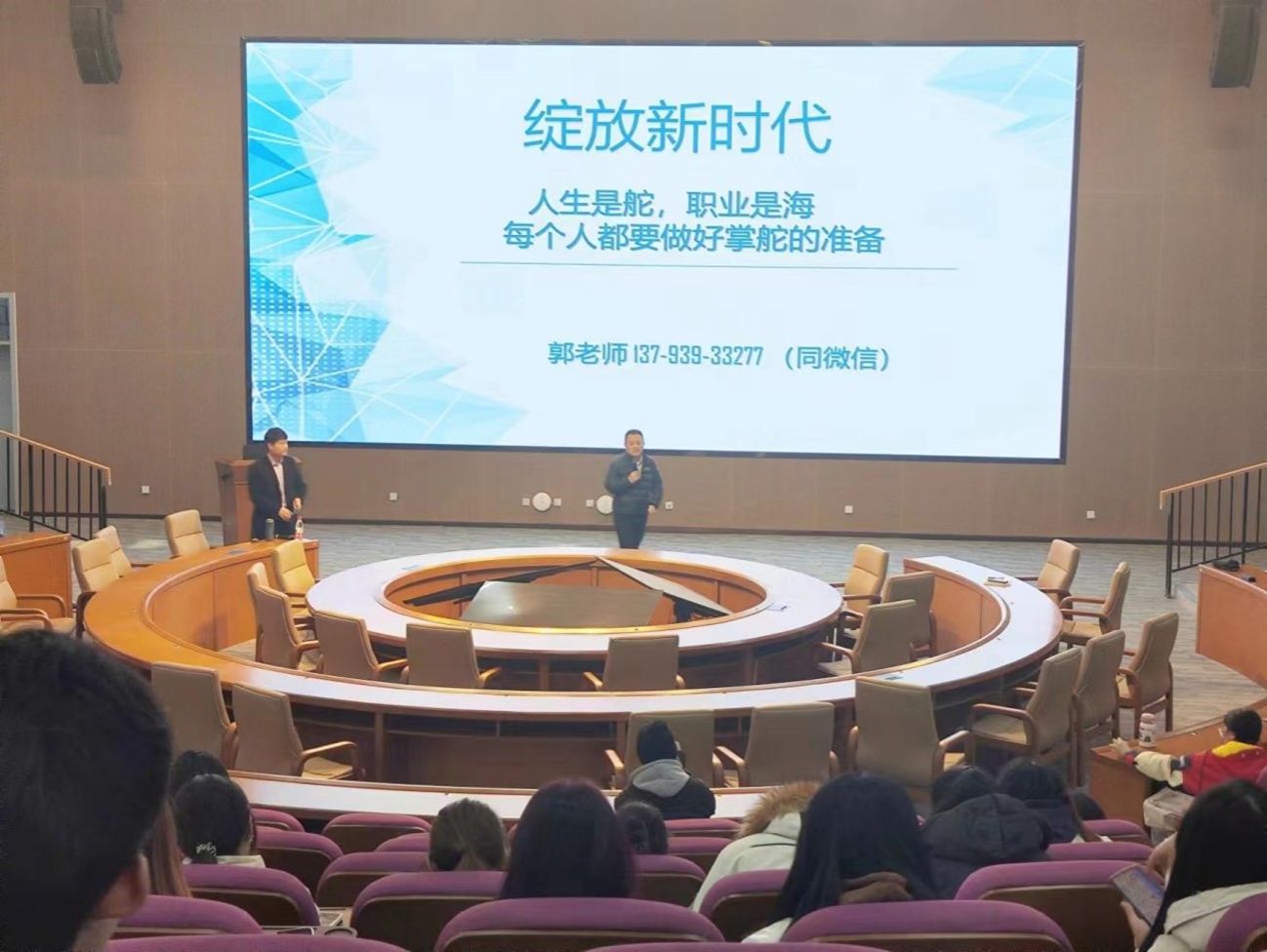 活动伊始,郭永帅经理为同学们点明职业规划以及职业指导课的重要意义,指出青年学生要有清晰的自我认知,从个人需求、兴趣、能力以及社会环境等因素综合考虑职业规划方向,从而做到精准就业。郭经理从企业“用人”的角度,针对目前大学生普遍面临的各种就业问题,从当下就业形势分析、行业分析、自我认知、求职方式、求职准备、面试技巧等六个方面对同学们进行了就业指导,使同学们更好地了解了当前就业形势,更早地做好个人职业规划。郭经理热切希望大学生可以做到“多读书、多见人、多旅行、逼自己、多怀疑”,明确自己的青春目标和理想,面临就业能够走出迷茫、克服困难,勇敢奋进人生之路。